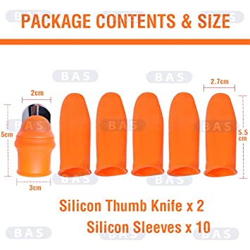 There is 1 piece thumb knives included in each package, paired with them is 3 silicone finger cuffs that can protect your hands from injury well.