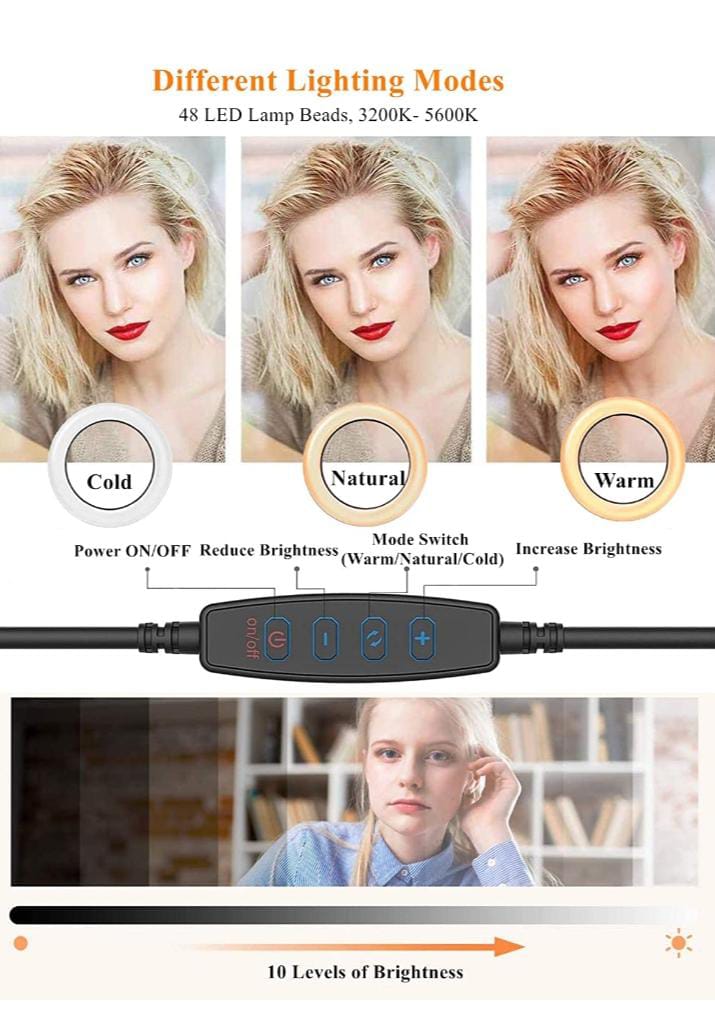 3 lighting modes & 10 brightness: Cold/Natural/Warm. Each lighting mode has 10 levels of adjustable brightness, which is the perfect partner for video conferencing. Perfect dimmable brightness and bright colors can create a unique atmosphere to meet your various needs.