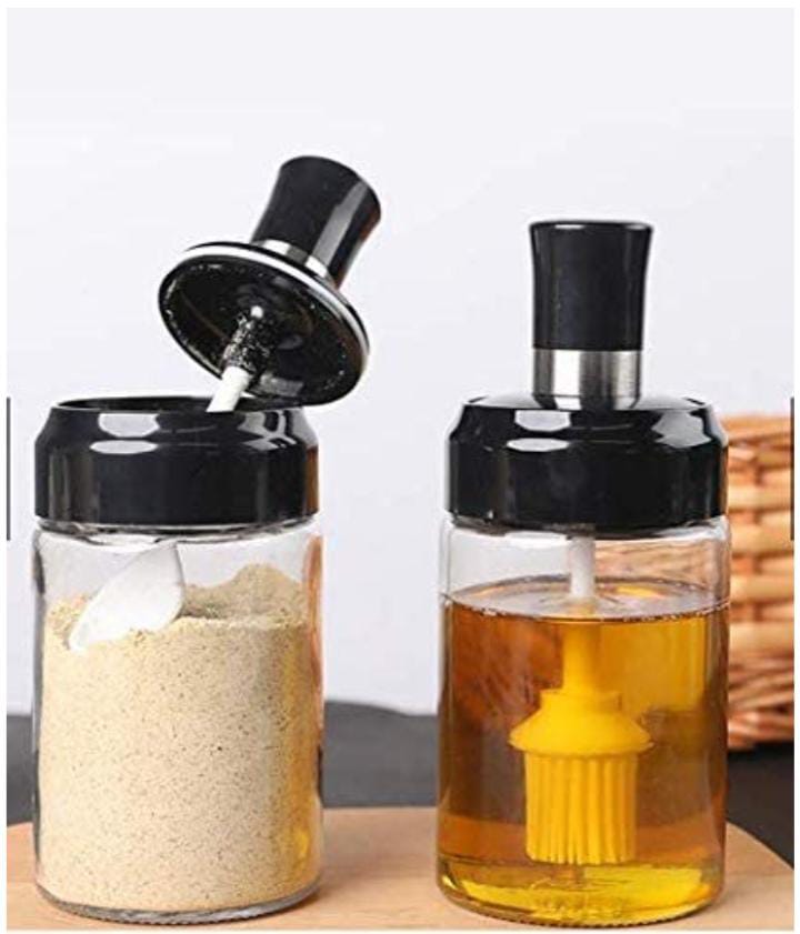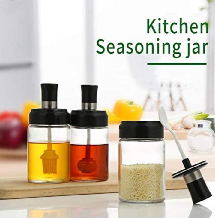 Salt Spoon, basting brush and lid. Each condiment jar comes with a leak-proof silicone seal ring on its lid, offering a secure airtight seal, preventing liquid leaking, dust and moisture to keep seasonings fresh for a longer time.